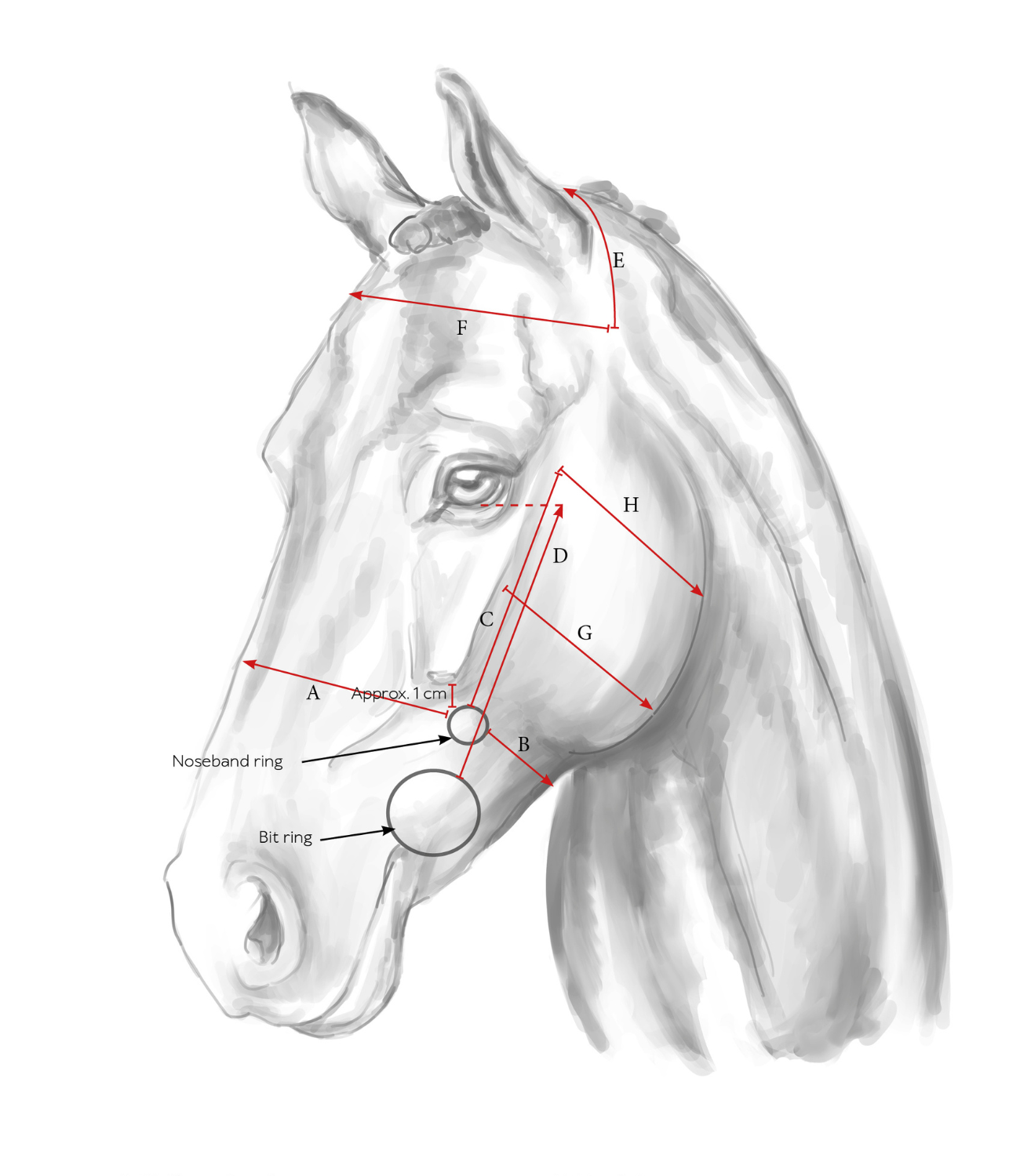 Measure from the position of one noseband ring, under the chin, to the position of the other noseband ring.